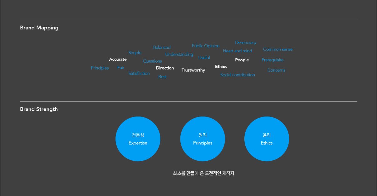 다른 부분들 보다 어떤 식으로 생각의 단계를 밟아갔으며, 수많은 맵핑 키워드 중에 어떤 키워드가 가장 우선이 되어야 하는지 그래픽으로 표현한 부분이 매력적이였다. '전문성'과 '원칙' 그리고 '윤리'가 한국갤럽의 아이덴티티가 되었을 것이며, 그것이 회사가 지향하고 있는 비전이 되었을거라고 생각된다. 매우 훌륭한 브랜딩으로, 매우 매력적이라는 표현을 안할 수가 없다.
