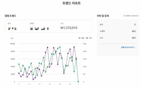 위는 필자가 19년 1월부터 한 달 동안 쿠팡 파트너스를 운영해본 결과이다. 2월부터 새롭게 집계가 시작되어 위의 일별 트렌드를 확인해보면 된다. 일별 트렌드에 구매액은 약 3,800만 원 정도로 소비자가 구매를 했고 이 중 수익은 130만 원 정도 결과가 생겼다.