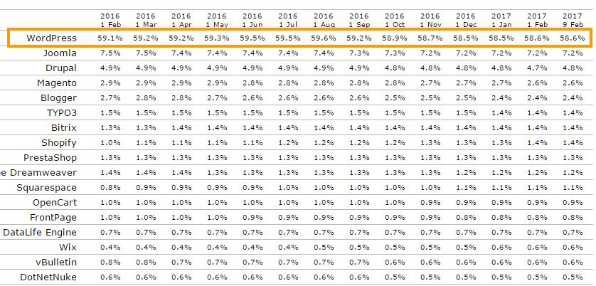 웹사이트를 쉽게 제작할 수 있는 CMS 툴의 전세계 점유율 표입니다. 꾸준이 커다란 변화없이 꾸준히 비슷한 양상을 보이고 있는 점유율 모습입니다. 아주 미세한 차이는 있으나, 워드프레스의 경우 전 세계 웹 사이트에서 약 59% 가량을 점유하고 있습니다. CMS는 콘텐츠관리시스템(Contents Management System)라 불리는데, 네이버 블로그도 어떻게 보면 CMS라고 할 수 있겠습니다. 티스토리도 마찬가지입니다.