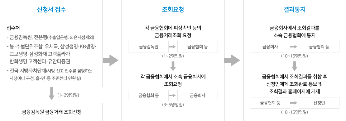 - 신청서를 제출한 후, 금융감독원은 각 금융기관에 조회를 요청합니다.