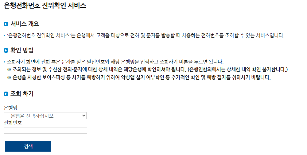 이 서비스는 은행을 사칭한 보이스피싱과 메신저 피싱으로 인한 금융 소비자 피해를 예방하기 위해 마련되었습니다. 사용자는 별도의 회원가입이나 로그인 절차 없이 은행연합회 홈페이지나 소비자포털 페이지에서 서비스를 이용할 수 있습니다.