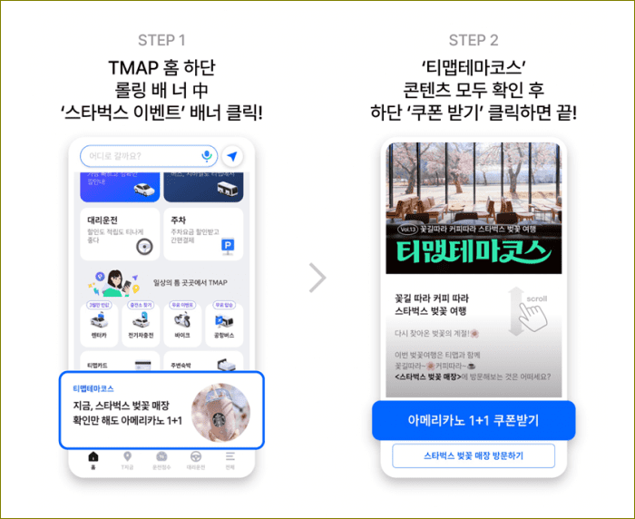 - 티맵 테마코스 Vol.13 스타벅스 벚꽃 매장 편을 확인해야 합니다(1개 매장만 확인해도 쿠폰을 받을 수 있음).