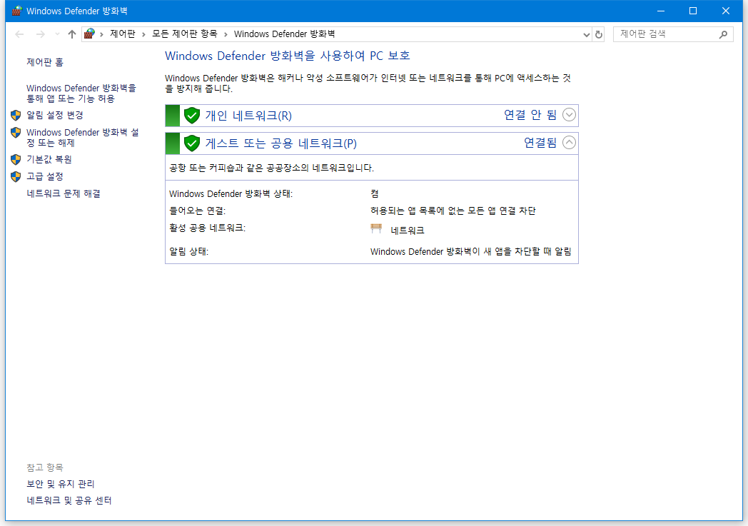 제 컴퓨터는 현재 정상적으로 윈도우 방화벽 설정이 되어 있습니다. 개인 네트워크와 게스트 또는 공용 네트워크로 분리가 되어 있는 것을 확인할 수 있습니다. 개인 네트워크와 게스트 또는 공용 네트워크는 처음에 식별되지 않은 인터넷을 설치할 때 설정하는 것에 따라서 달라질 수 있습니다.