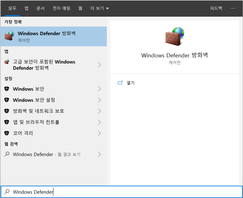 제어판에 들어가서 찾을 수 있지만, 우리는 쉽게 윈도우 10의 윈도우키를 눌러서 검색창을 활성화 해줍니다. 검색창에다가 Windows Defender를 타이핑해서 제어판에 있는 Windows Defender 방화벽을 클릭합니다.