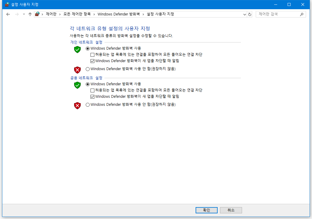 위 기능에서 개인 네트워크 설정과 공용 네트워크 설정을 사용 또는 사용 안함으로 설정을 할 수 있습니다. 일반적으로는 설정을 해주시는 것이 좋고 특별한 앱 또는 프로그램을 실행시킬 때에 방화벽이 문제가 된다면 해당 앱만 기능 허용을 해주시면 되겠습니다.