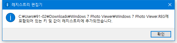 위의 파일을 다운로드 한 후 파일을 압축해제 한 다음에 레지스트리 파일을 클릭합니다. 그러면 아래와 같은 창이 뜨면서 레지스트리 값이 추가된 것을 확인할 수 있습니다.