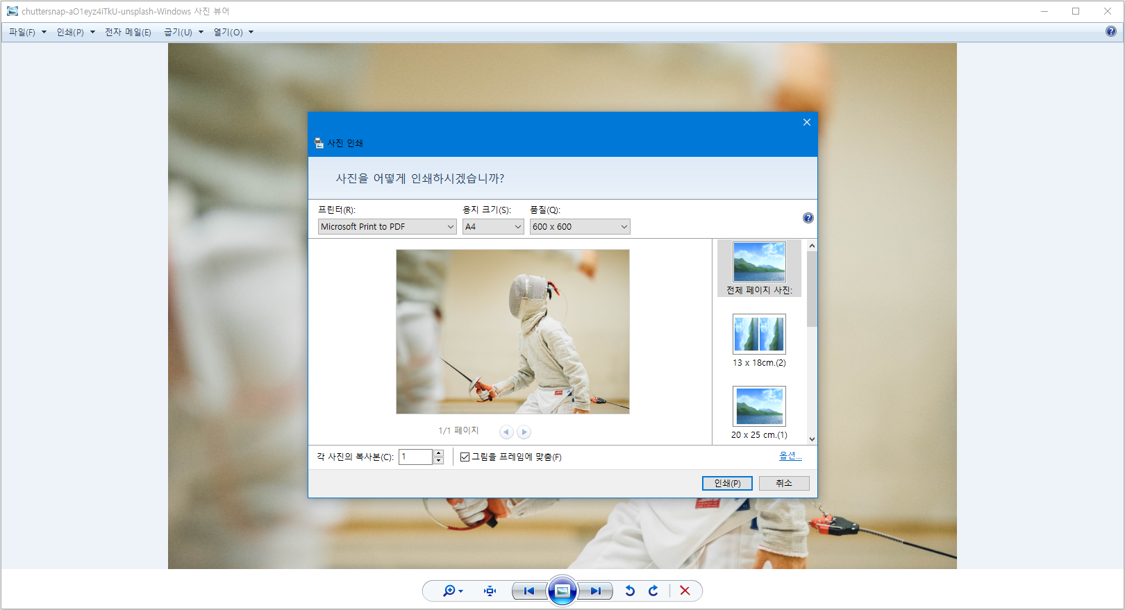 위와 같이 윈도우 10에서도 윈도우 7에서 자주 사용하던 사진 뷰어를 사용하실 수 있게 됩니다. 당연히 윈도우 7 사진 뷰어의 가장 큰 장점인 인쇄 기능에서 페이지 레이아웃을 선택할 수 있어서 굉장히 간편하게 사용할 수 있습니다. 또한, 윈도우 10에 비해서 훨씬 사진 전환 속도가 가볍게 느껴질 수 있습니다.