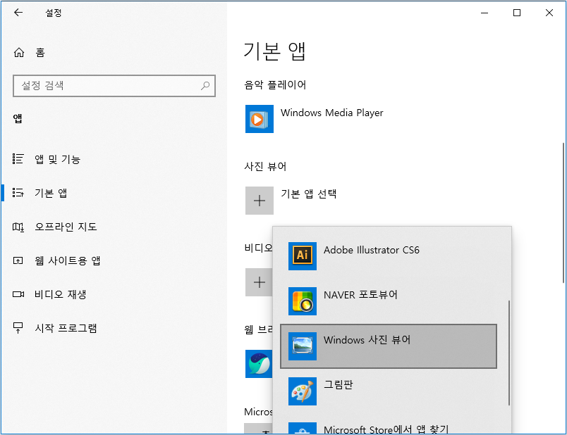이 다음에는 윈도우 설정으로 들어가서 앱에서 기본 뷰어를 바꿔주시면 됩니다. 윈도우 설정은 왼쪽 하단 윈도우키를 클릭한 다음 톱니바퀴 아이콘을 클릭하시거나 검색창에서 설정이라고 검색하면 쉽게 찾을 수 있습니다.