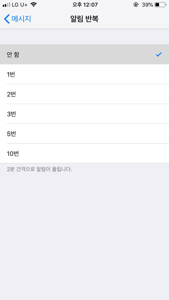 문자 메시지 알림이 한 번만 오기를 원한다면 안 함으로 설정을 해주시면 됩니다. 각 알림은 2분 간격으로 알림이 울리기 때문에 2번이라면 2분마다 2번이 울립니다. 최대 10번까지 설정이 가능합니다.