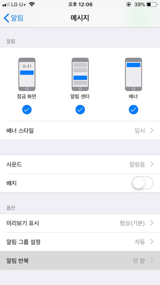 맨 하단에 위치한 알림 반복을 통해서 알림 횟수를 조절할 수 있습니다. 이외에도 미리 보기 표시나 알림 그룹을 따로 설정이 가능하고, 문자 메시지 알림 사운드도 변경이 가능합니다. 알림음은 기본 알림으로 되어 있다면 익숙한 알림음으로 설정이 되어 있는 것입니다. 배너 스타일은 문자메시지가 왔을 때 어떤 환경에서 메시지가 오는지 설정할 수 있습니다.