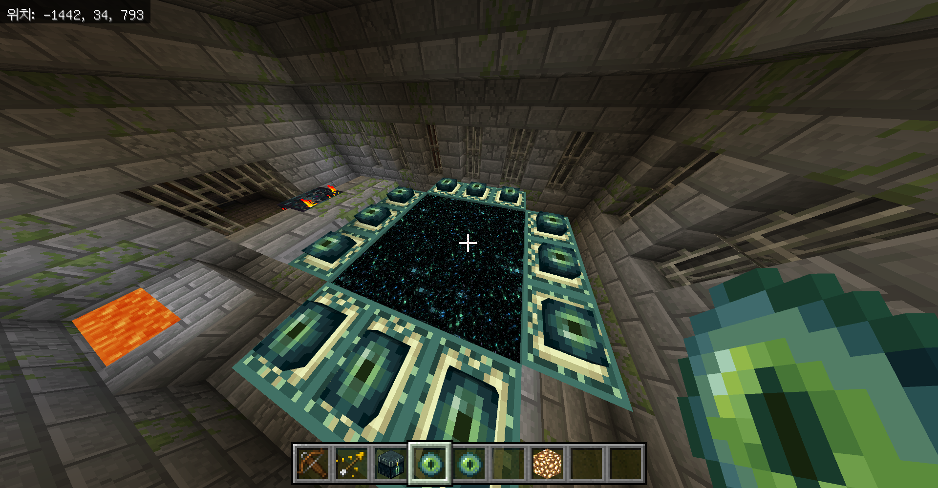엔더 요새를 찾은 후, 엔더 포탈을 활성화하기 위해서는 빈 공간에 엔더의 눈을 채워 넣어야 합니다. 모든 눈을 올바르게 끼워 넣으면, 포탈이 활성화되고 엔더월드로 이동할 준비가 완료됩니다.