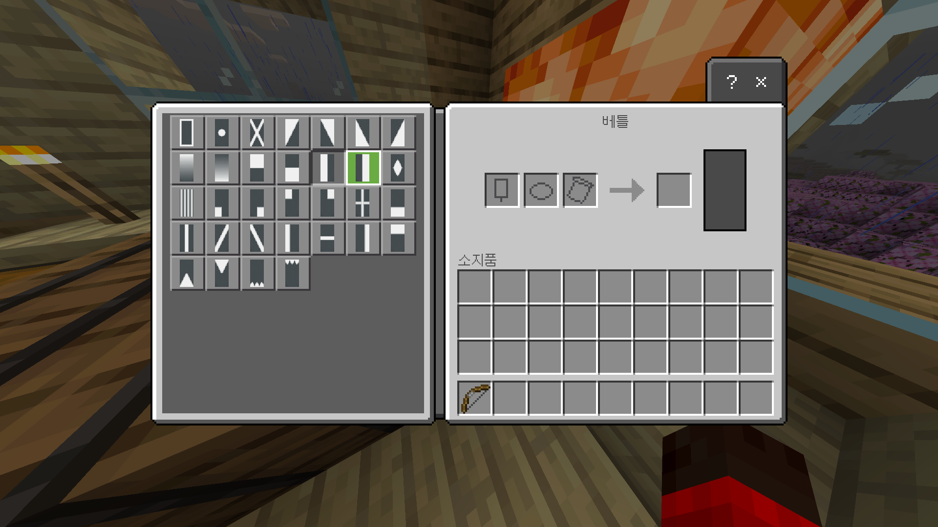 베틀을 만들기 위해서는 나무판자 2개와 실 2개가 필요합니다. 나무판자 2개를 가로로 배치하고 그 위에 실 2개도 가로로 배치해주면 베틀이 완성됩니다. 조합법이 간단해서 서바이벌 모드에서도 쉽게 만들 수 있습니다.