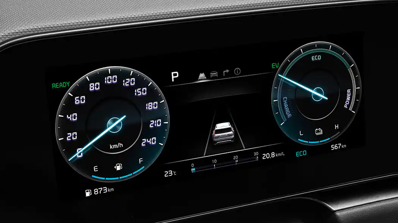 실내는 고급스러운 느낌과 함께 실용성을 최대한 고려한 설계가 돋보입니다. 친환경 소재의 사용과 넓은 적재 공간은 니로 하이브리드의 실용적인 면모를 강조합니다. 2열 좌석을 접으면 최대 54.6 입방피트의 적재 공간을 제공하며, 디지털 계기판과 10.25인치 인포테인먼트 시스템이 통합된 듀얼 스크린은 사용자의 편의를 위해 설계되었습니다.