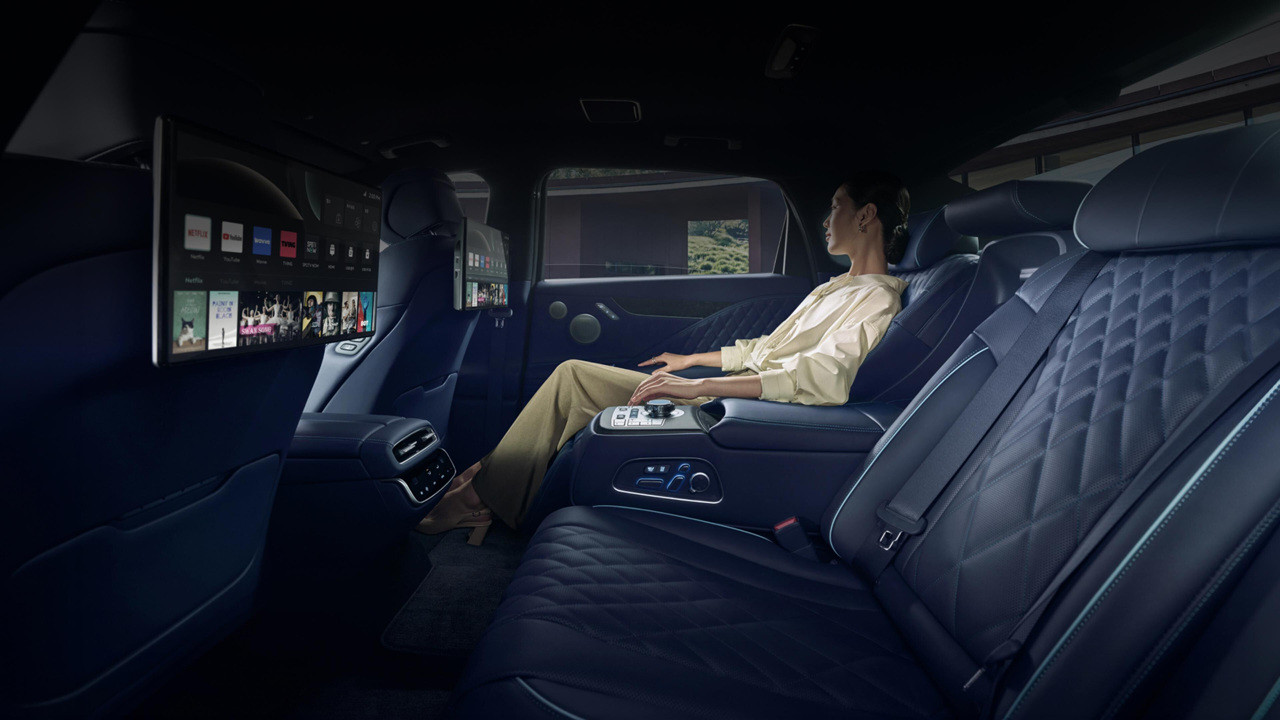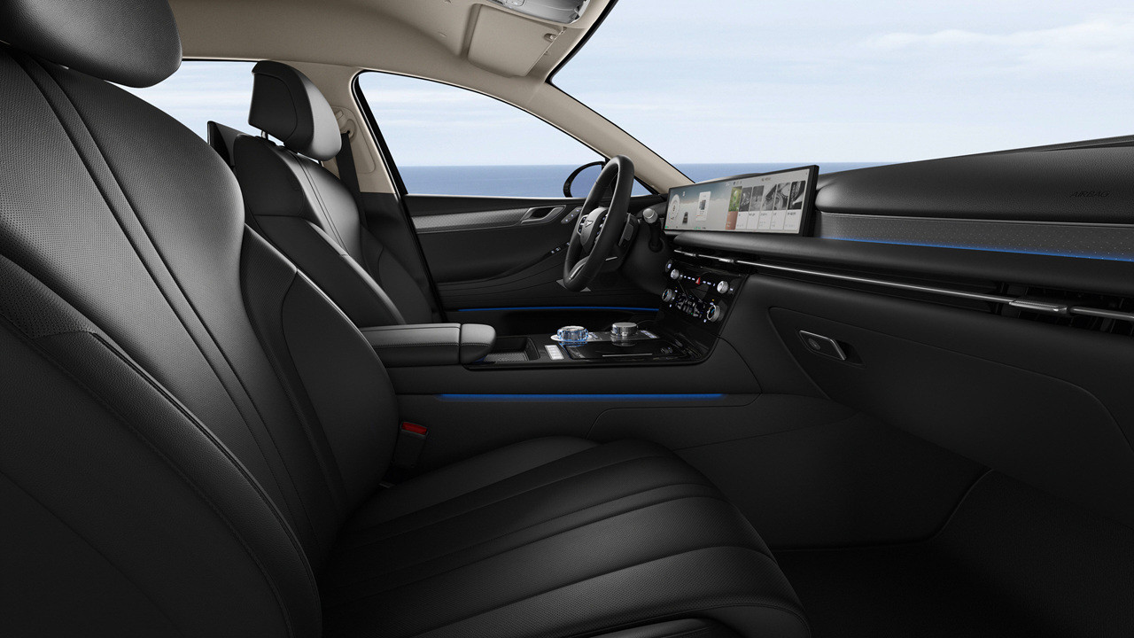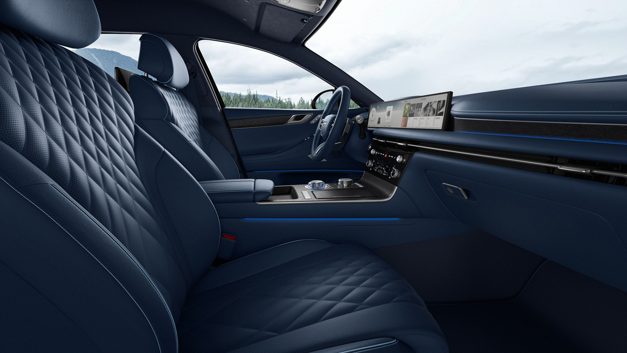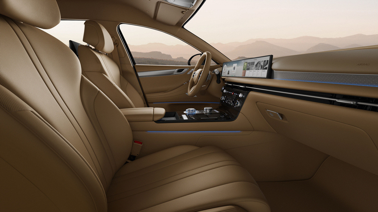 일렉트리파이드 G80의 내외부 디자인은 '역동적인 우아함'을 테마로 하여, 고급스러움과 현대적인 감각이 조화를 이룹니다. 내부에는 나파 가죽 시트와 자연 염색이 적용되어 있으며, 가구 제조업체에서 재활용한 목재 조각으로 만든 포지드 우드 가니쉬가 세련된 친환경적인 강조점을 더합니다.