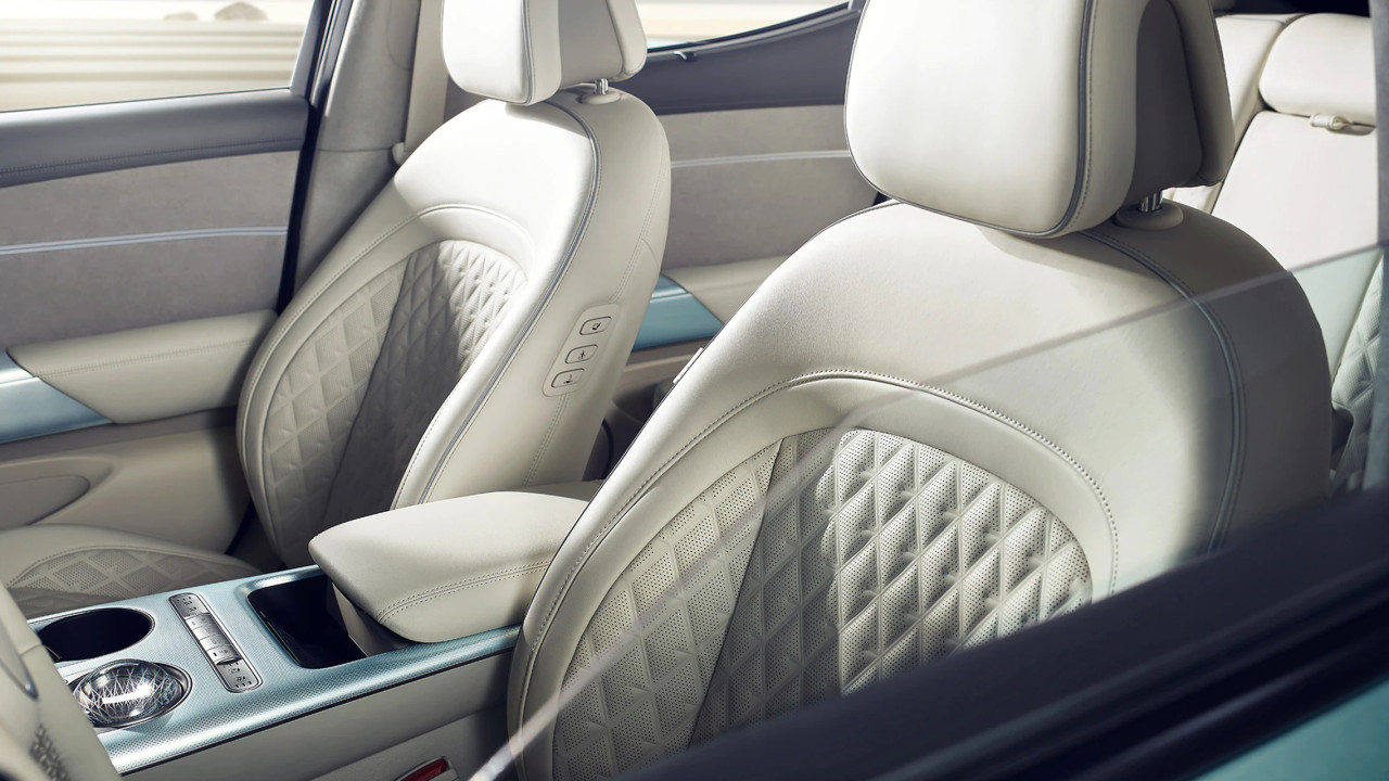 GV60의 외관은 길이 177.8인치, 너비(미러 제외) 74.4인치, 높이 62.4인치의 치수를 가지며, 114.2인치의 휠베이스를 자랑합니다. 차량의 전면에는 제네시스의 상징적인 크레스트 그릴이 자리잡고 있으며, 두드러진 라인과 곡선이 조화를 이루어 역동적인 모습을 연출합니다. 또한, 파워 리트랙터블 도어 핸들과 제네시스 로고 퍼들 램프 등의 세련된 디테일이 차량의 고급스러움을 더합니다.