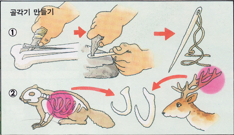 골각기(骨角器) : 짐승의 뼈나 뿔로 만든 도구. 구석기·신석기 시대에 동물이나 생선을 먹은 뒤 뼈나 뿔을 재료 삼아 바늘, 송곳, 낚시바늘, 작살, 창끝, 도끼 등과 장신구나 의례용 도구도 제작하였다.