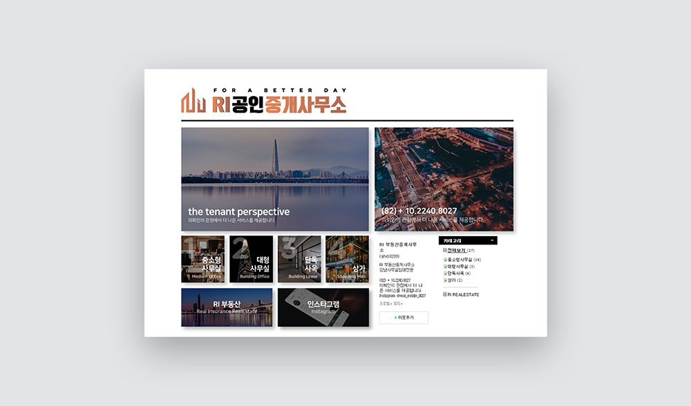 | 프로젝트 | 현재 강남 지역의 부동산은 하락세인 것은 틀림이 없습니다. 특히, 매매부분에서 그렇습니다만, 저도 역시 부동산을 했기 때문에 부동산 분야에서 어떤 부분은 그래도 안정적인지에 대한 생각이 있습니다. 최근에는 지인들을 대상으로 블로그스킨 디자인을 해주고 있습니다. 위의 경우도 부동산블로그입니다. 강남이나 타지역에서 부동산을 운영하시거나 개업을 하셨다면 광고쪽에 있어서 네이버블로그 시장은 굉장히 중요합니다.따라서, 부동산 블로그 디자인을 할 때에도 너무 화려하게 디자인을 하기 보다는 깔끔한 정도로도 충분합니다. 고객이 어떤 내용을 찾고 싶어하는지 직관적인 UI가 가장 중요합니다. 그 점을 강조해서 제작된 디자인입니다. 로고부터 깔끔하게 제작을 했고, 더 화려하게 디자인이 가능하기도 하겠지만 위의 디자인으로 충분히 그 점을 살릴 수 있다는 생각입니다. |