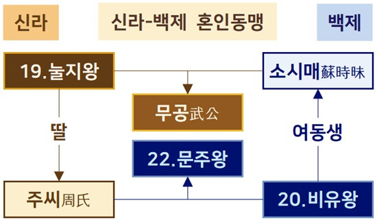 눌지마립간은 고구려의 영향에서 벗어나고자 백제와의 나제동맹을 체결합니다. 고구려의 장수왕이 평양으로 천도하면서 남하 정책을 본격화하자, 신라는 백제와 손을 잡게 되었습니다. 나제동맹은 433년(눌지마립간 17년)에 시작되었으며, 백제의 비유왕이 먼저 신라에 화친을 청하면서 성립되었습니다. 이듬해 백제는 말 두 필과 흰 매를 신라에 선물했고, 신라는 이에 금과 명주로 답례했습니다.