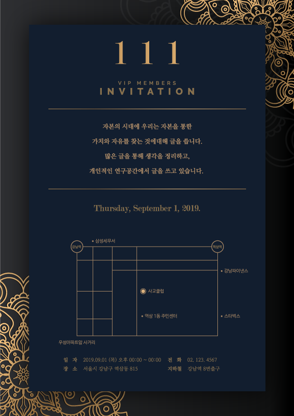 개인적인 용도로 디자인을 한 초대장 이미지입니다. 외부 소스를 추가해서 사용을 했고, 간단한 웹용 초대장으로 사용할 수 있습니다. 일러스트파일을 첨부할 것이고 폰트는 모두 무료폰트를 이용했습니다. 한글부분은 모두 나눔명조체를 사용했습니다. 이외에 영문폰트는 부분마다 다르고 숫자 부분은 클리핑마스크로 그라데이션 효과를 넣었습니다.