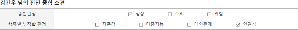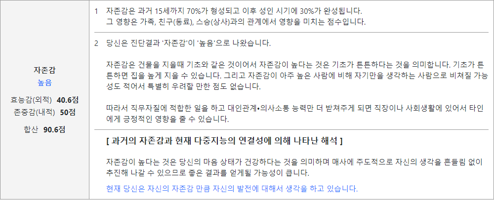 사람마다 살아온 과정 중에서 때때로 시기마다 이 자존감 수치가 다를 수 있기 때문에, 만약 현재 종합진단 결과가 좋지 않게 나오더라도 그게 모든 것을 대변하지는 않는 것이다.