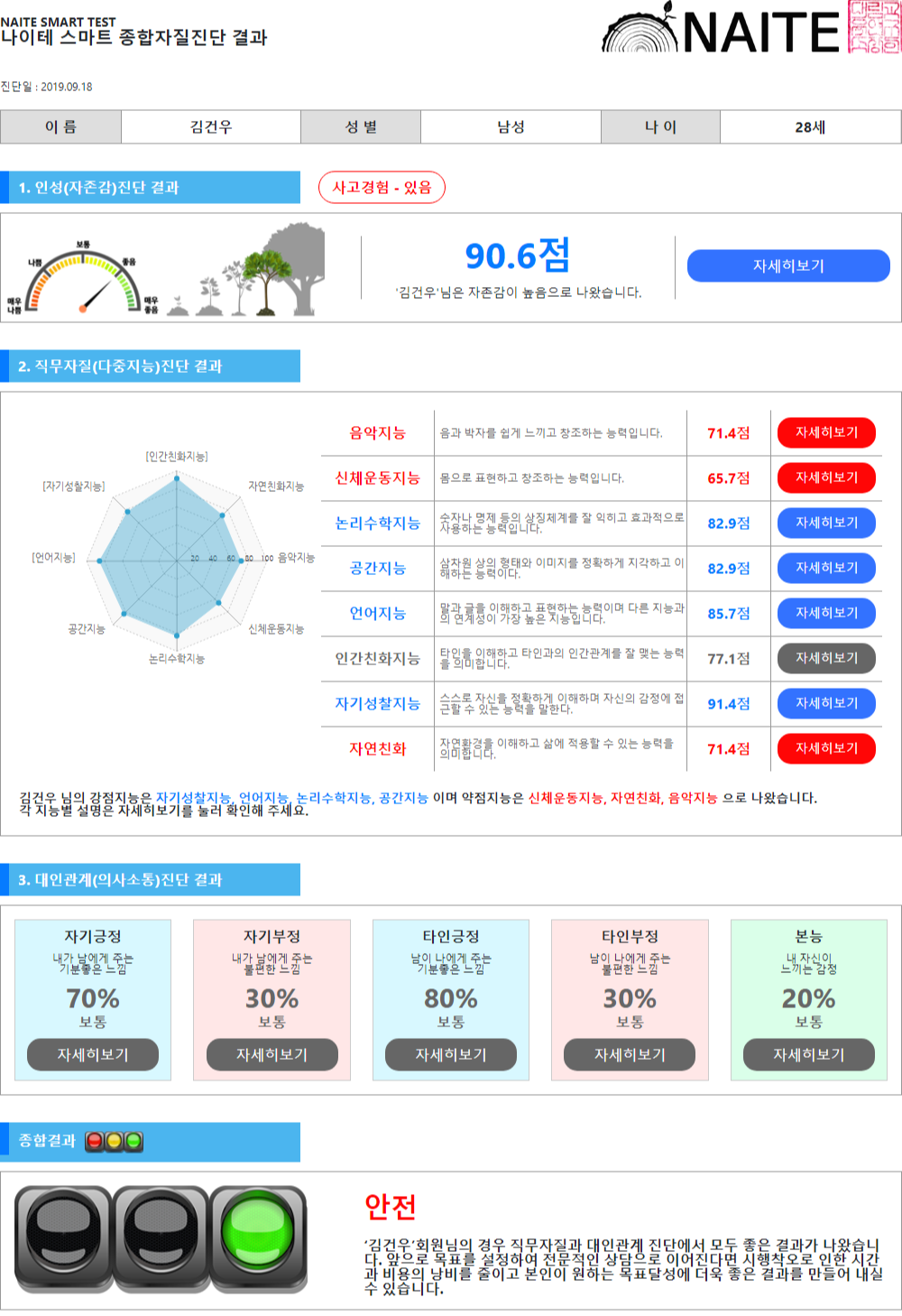 사람마다 살아온 과정 중에서 때때로 시기마다 이 자존감 수치가 다를 수 있기 때문에, 만약 현재 종합진단 결과가 좋지 않게 나오더라도 그게 모든 것을 대변하지는 않는 것이다.