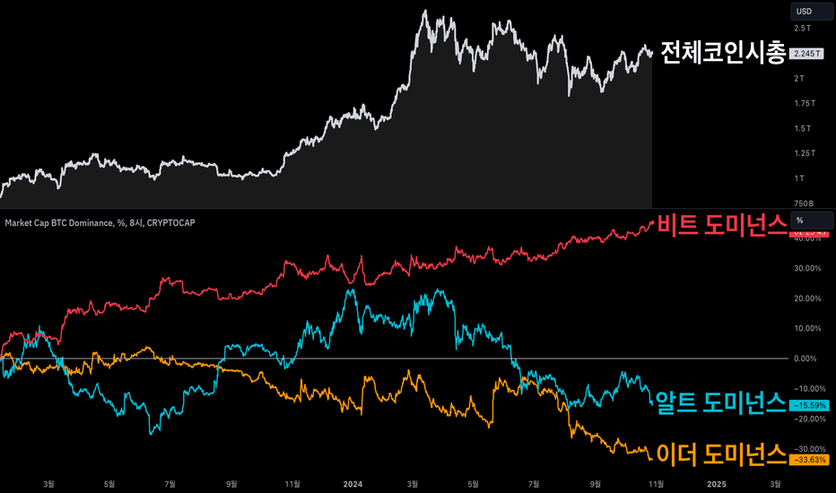 비트코인 도미넌스가 상승한다는 것은 비트코인에 대한 투자 비중이 높아지고 있음을 나타냅니다. 이는 투자자들이 비트코인을 더 선호하거나, 알트코인에서 비트코인으로 자금이 이동하고 있음을 의미할 수 있습니다. 일반적으로 시장이 불안정할 때 투자자들은 상대적으로 안정적인 자산으로 간주되는 비트코인에 자금을 집중시키는 경향이 있습니다.