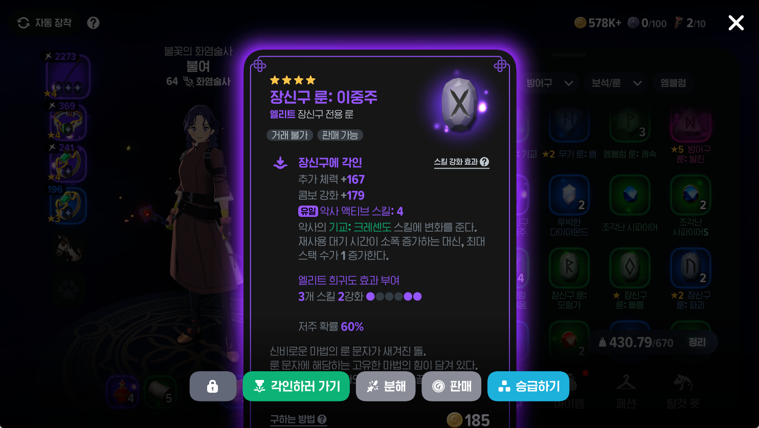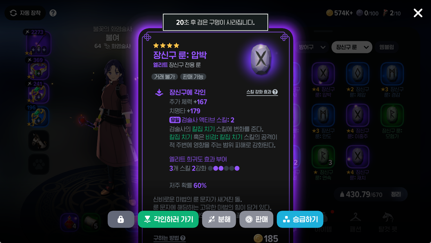 - 룬 분리: 희귀도 고급 이상 장비를 분해하면 각인된 룬을 회수할 수 있어요. 하지만 장비 자체는 사라지므로 주의해야 해요. 룬만 따로 빼낼 수는 없어요.