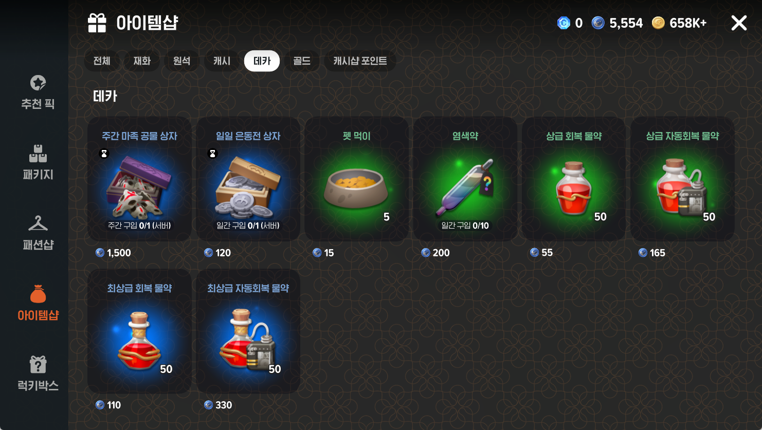 아이템샵을 통해서도 은동전을 수급할 수 있어요.- 데카 상점: 게임 내 활동(퀘스트 보상 등)으로 얻을 수 있는 '데카'라는 재화를 사용하여 아이템샵에서 '일일 은동전 상자'를 구매할 수 있어요. 이 상자에는 은동전 10개가 들어있고, 하루에 한 번만 구매할 수 있어요. 무과금 유저도 데카를 모아 구매할 수 있으니 매일 잊지 말고 구매하는 것이 좋아요.