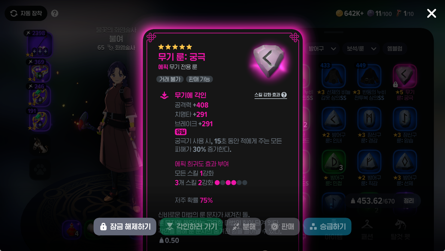 여기서 가장 중요한 점은 룬을 회수하거나 룬의 재료를 얻기 위해서는 룬이 각인된 장비를 분해해야 해요.