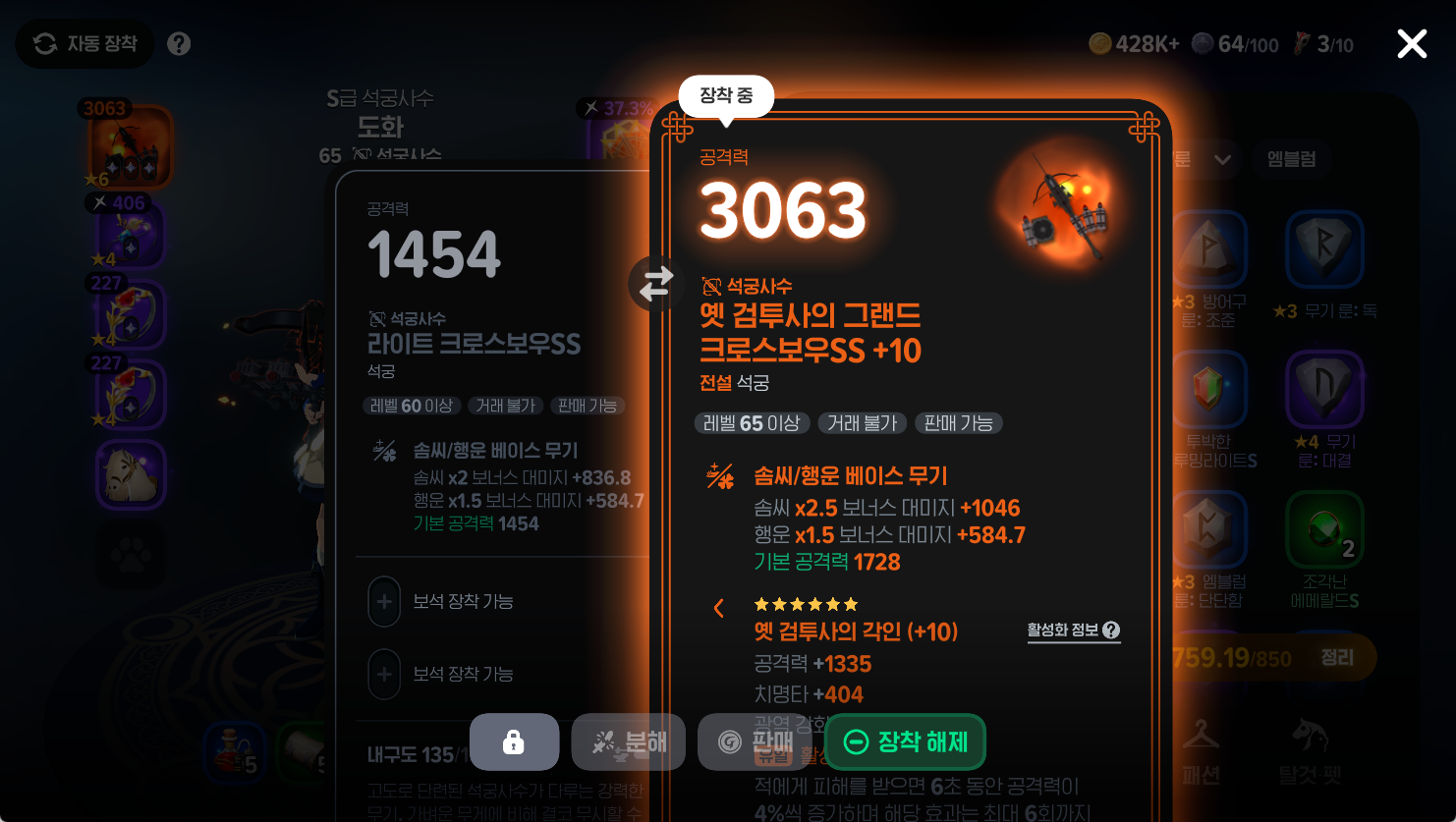 - 분해 대상 선택: 인벤토리에서 전설 룬이 각인된 장비를 선택하여 분해를 시도해요.