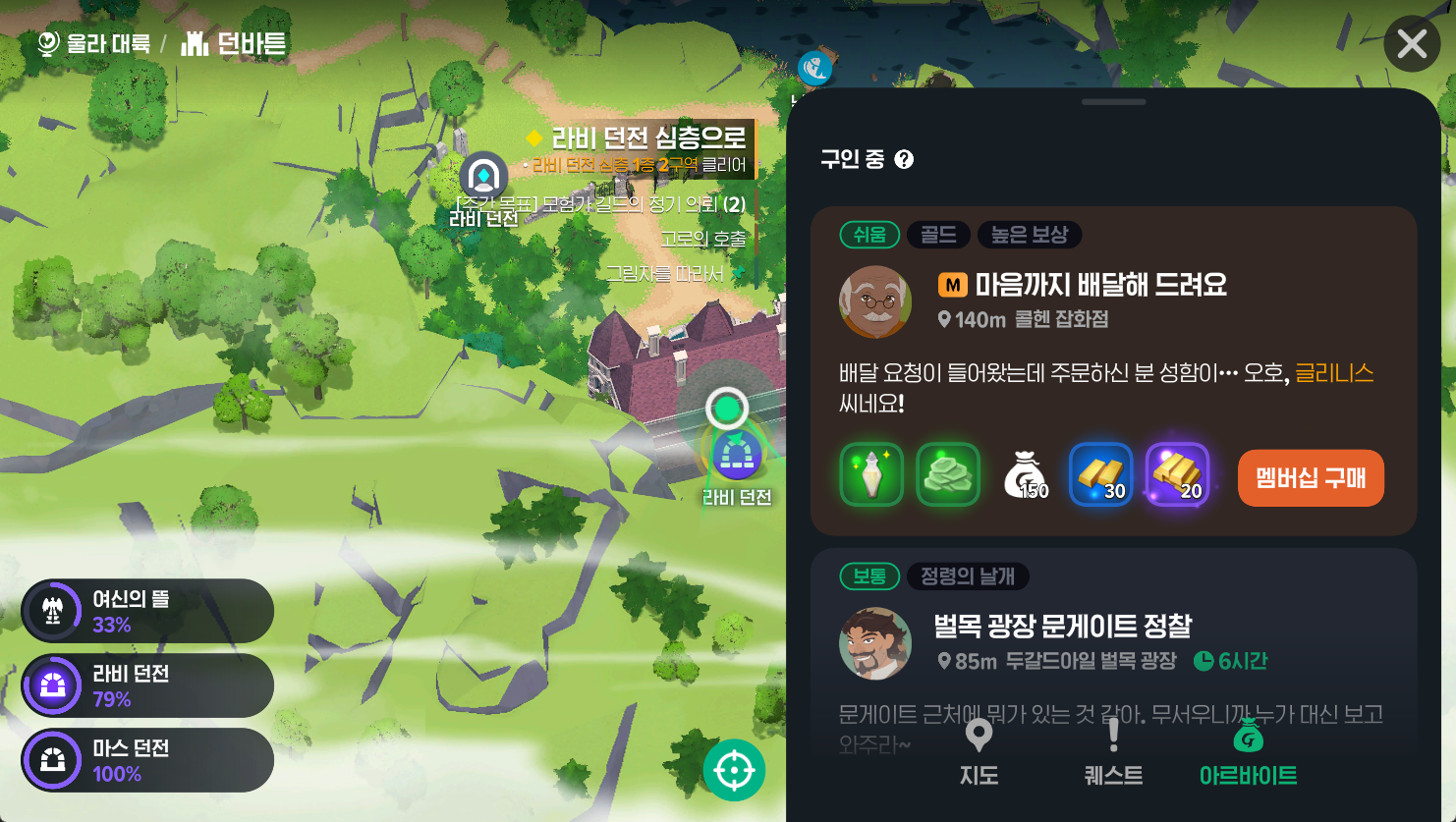 메인 화면 우측 상단 메뉴([≡] 아이콘)를 통해 '아르바이트' 탭으로 들어가면 현재 진행 가능한 아르바이트 목록을 확인할 수 있어요. 메인 퀘스트를 진행하다 보면 새로운 아르바이트가 해금되고, 각 마을의 주민들과 대화하여 아르바이트를 수락할 수 있답니다. 여러 개의 아르바이트를 동시에 수락해서 진행하는 것도 가능해요.