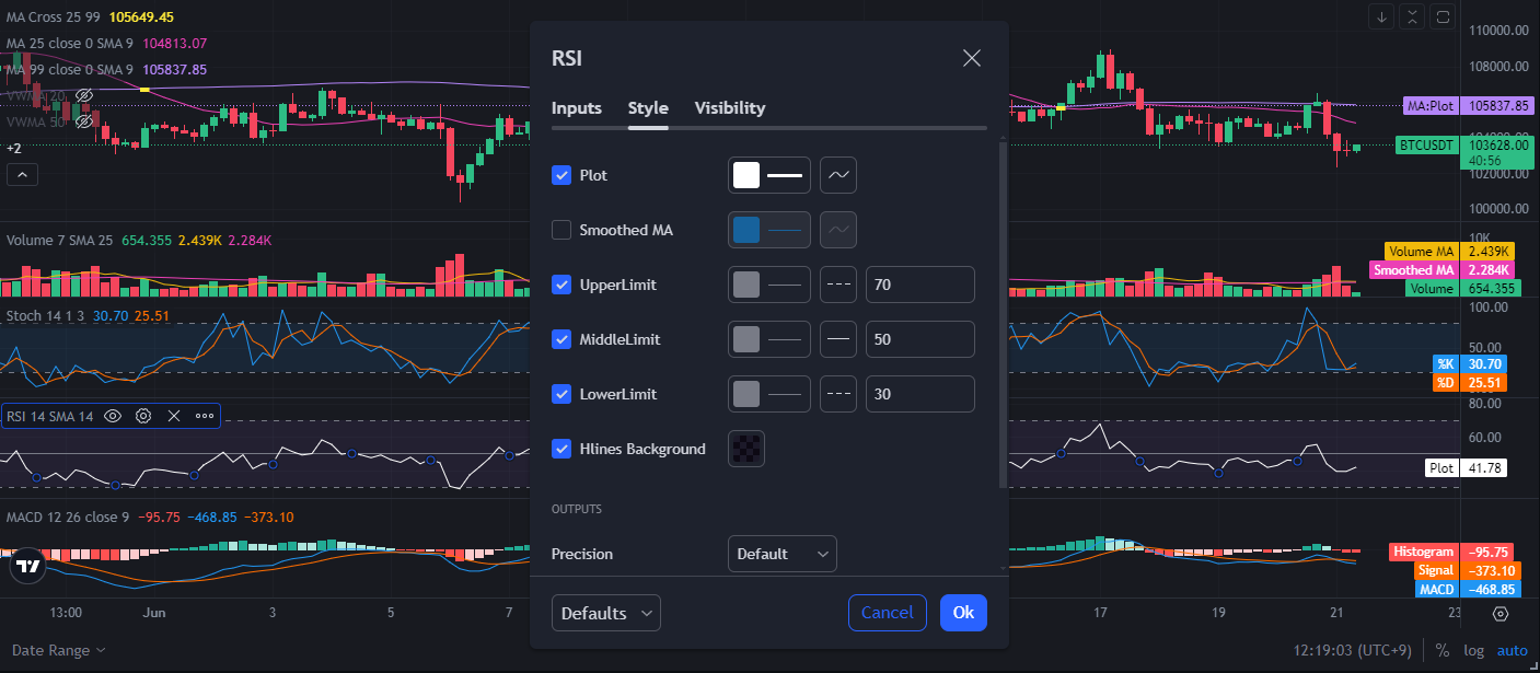 그다음으로는 RSI 선과 RSI Middle Band(중간선)의 색상을 눈에 잘 띄는 색으로 바꿔줍니다. 영상에서는 두 선 모두 하얀색으로 변경하여 시인성을 높였습니다. 일반적으로 RSI는 과매수와 과매도 구간을 파악하는 데 사용되지만, 이 스토캐스틱 RSI MACD 매매법에서는 추세를 판단하는 도구로써 그 역할이 달라집니다. RSI 선이 중간선 위쪽에 위치하면 상승 추세, 아래쪽에 위치하면 하락 추세로 간주하여 매매의 방향을 결정하는 중요한 기준으로 삼습니다.