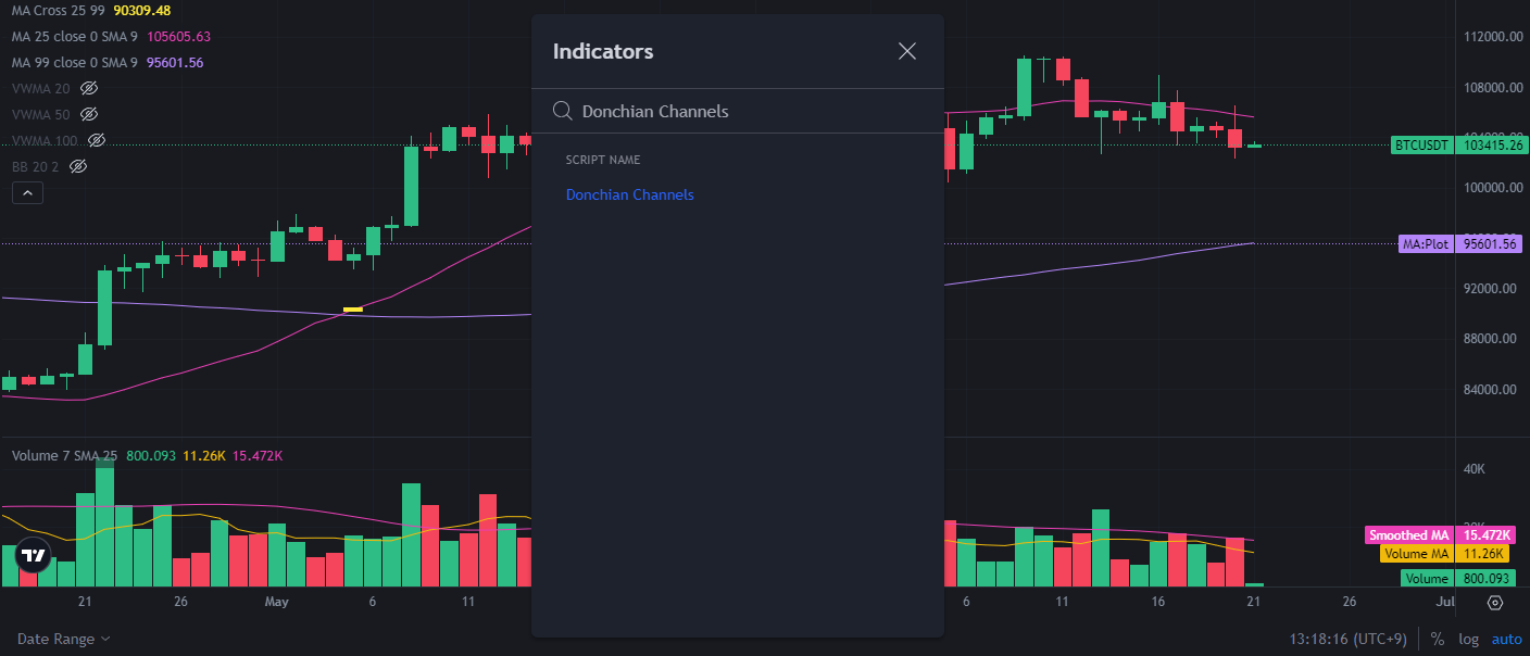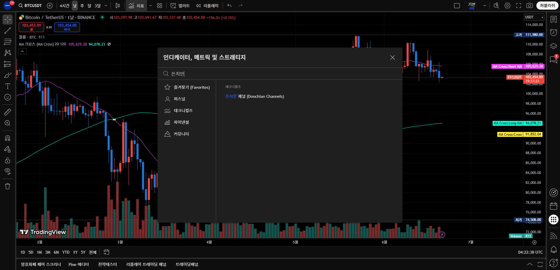 첫 번째로 추가할 지표는 '돈치안 채널'입니다. 지표 검색창에 '돈치안 채널'을 입력하고 차트에 적용합니다. 돈치안 채널은 설정된 기간 동안의 최고가와 최저가를 선으로 연결하여 만들어진 채널입니다.