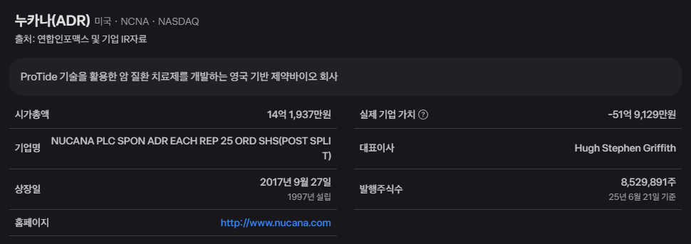 투자에 앞서 가장 먼저 확인해야 할 것은 내가 투자하려는 기업이 어떤 사업을 하는 곳인지 명확히 아는 것입니다. 누카나(NCNA)는 영국에 본사를 둔 임상 단계의 바이오 제약 회사입니다. 주로 암 치료를 위한 혁신적인 의약품 개발에 주력하고 있으며, 기존 항암제의 한계를 극복하는 것을 목표로 연구 개발을 진행하고 있습니다. 특히, 프로드러그(ProTide) 기술을 활용하여 암세포에 약물을 효과적으로 전달하고 부작용을 최소화하는 새로운 형태의 항암제를 개발하는 것으로 알려져 있습니다.