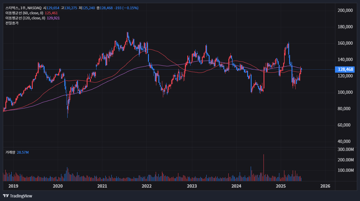최근 스타벅스 주가는 다소 부진한 모습을 보이고 있습니다. 2025년 6월 20일 종가 기준으로 104,115원을 기록하며 전일 대비 소폭 하락 마감했습니다. 연초 대비 수익률 역시 마이너스를 기록하고 있으며, 52주 최고가인 141,608원에 비하면 상당히 하락한 수준입니다. 이러한 약세는 최근 발표된 실적과 무관하지 않습니다.