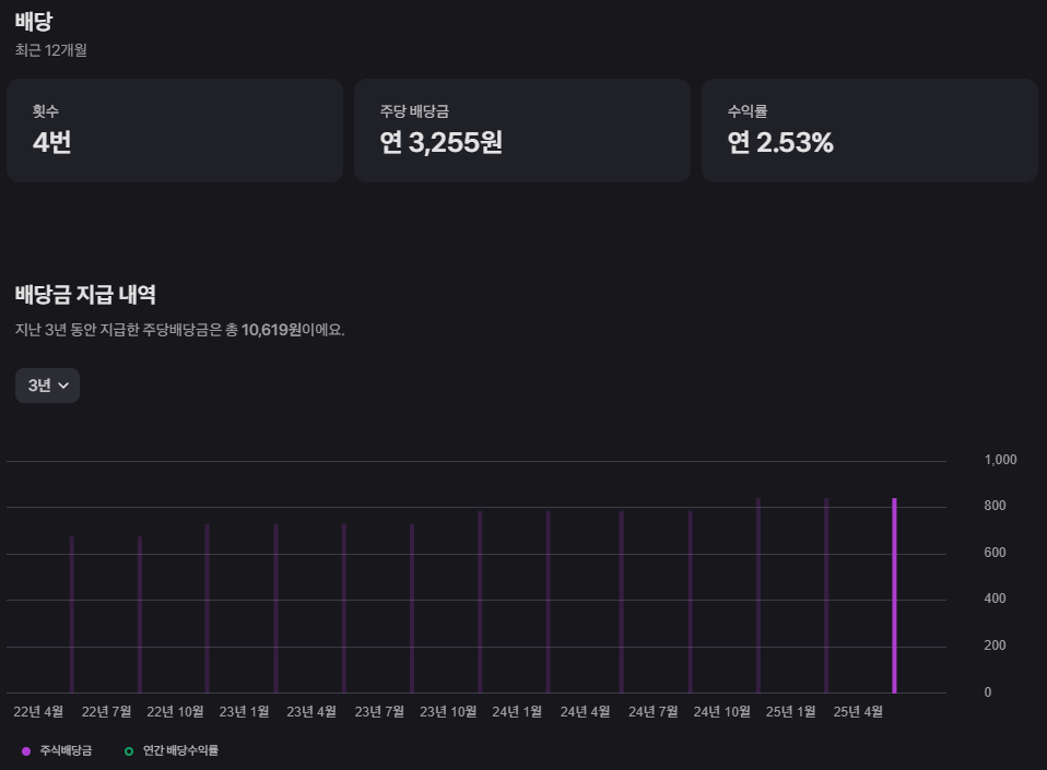 스타벅스는 꾸준히 배당금을 지급하며 대표적인 배당 성장주 중 하나로 꼽힙니다. 최근 12개월 동안 총 4차례의 배당을 통해 연간 약 2.94%에 달하는 비교적 높은 배당수익률을 제공하고 있습니다. 이는 주가 하락 시기에는 주가의 추가적인 하락을 방어해 주는 역할을 하며, 장기 투자자들에게는 안정적인 현금 흐름을 창출해 주는 중요한 요소입니다. 어려운 시기에도 주주 환원 정책을 꾸준히 이어간다는 것은 그만큼 기업의 현금 창출 능력과 재무 구조가 안정적이라는 방증이기도 합니다.