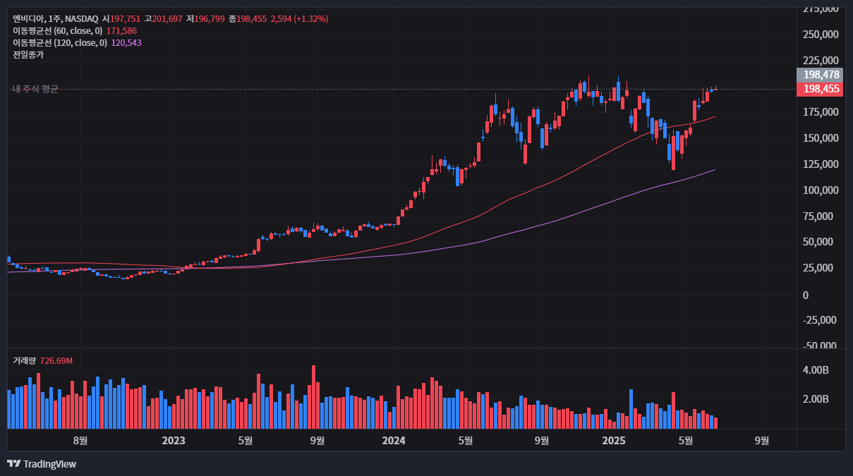 최근 엔비디아의 주가는 꾸준한 우상향 곡선을 그려왔습니다. 토스증권에 따르면 2024년 6월 20일 기준 주가는 약 198,455원으로, 하루 거래대금이 48조 원에 이를 정도로 활발한 거래가 이루어지고 있습니다. 물론 주식 시장의 특성상 단기적인 등락은 있지만, 장기적인 관점에서의 성장세는 매우 뚜렷합니다.