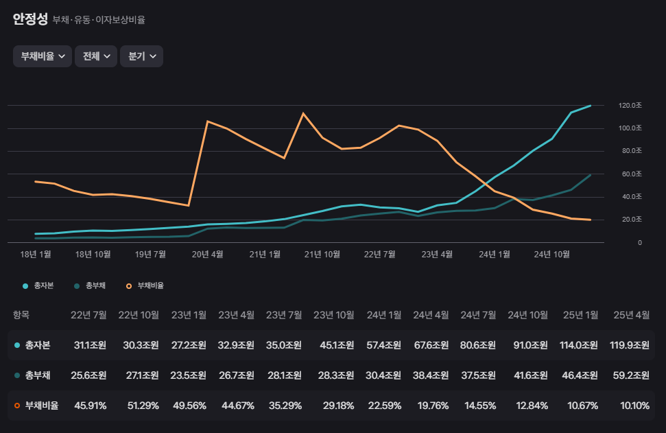 투자를 결정할 때 가장 중요하게 봐야 할 것 중 하나가 바로 기업의 재무 건전성입니다. 엔비디아는 이 부분에서 매우 인상적인 모습을 보여줍니다. 2025년 4월 기준, 총자본은 약 120조 원에 달하는 반면, 총부채는 59조 원 수준입니다.