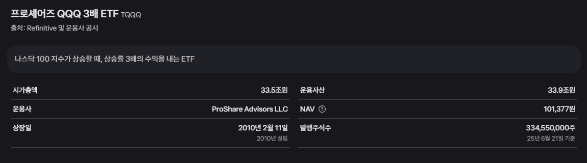 TQQQ의 정식 명칭은 '프로셰어즈 QQQ 3배 ETF(ProShares UltraPro QQQ)'로, 자산운용사 프로셰어즈(ProShare Advisors LLC)가 운용하고 있습니다. 시가총액은 약 33.5조 원, 운용자산 규모는 약 33.9조 원에 달하는 거대한 ETF입니다.