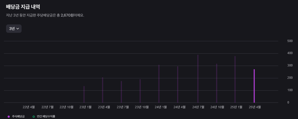 TQQQ는 분기별로 배당금을 지급하는 특징도 가지고 있습니다. 2025년 3월에는 주당 272원의 배당금을 지급했으며, 연간 배당수익률은 약 1.33% 수준입니다. 배당금 내역을 보면 꾸준히 지급이 이루어지고 있지만, 배당수익률 자체가 높지는 않기 때문에 TQQQ를 배당주처럼 접근하는 것은 바람직하지 않습니다. 어디까지나 주가 상승에 따른 시세차익을 주목적으로 하는 상품이며, 배당은 부수적인 요소로 생각하는 것이 좋습니다.