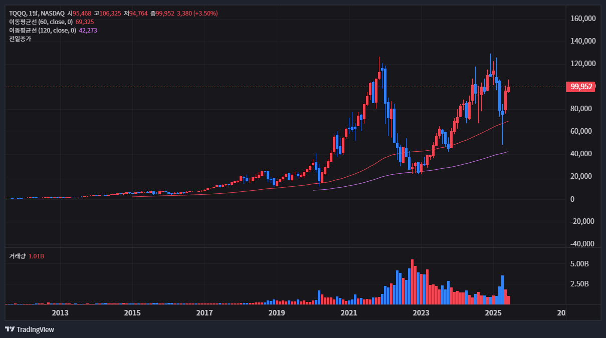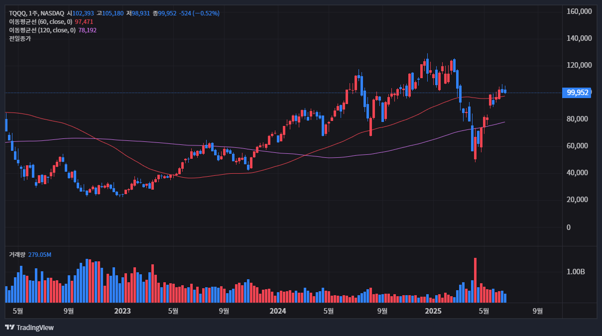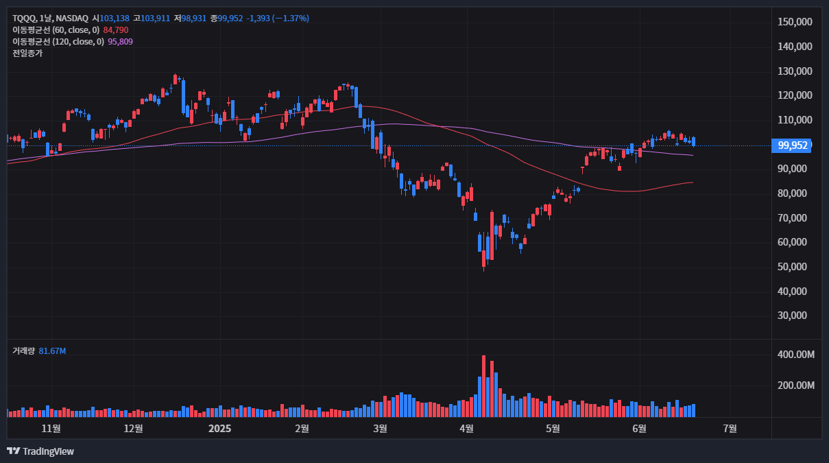 최근 TQQQ의 주가 흐름을 살펴보면 변동성이 매우 크다는 것을 알 수 있습니다. 토스증권에 따르면 2025년 6월 20일 기준 TQQQ는 약 1.37% 하락한 99,952원에 마감했으며, 이날 거래량은 8천만 주를 넘어서며 많은 투자자들의 관심이 집중되었음을 보여주었습니다. 바로 며칠 전인 6월 16일에는 4%가 넘는 급등을 보이기도 했지만, 다음 날에는 다시 3% 가까이 하락하는 등 롤러코스터 같은 움직임을 보였습니다.