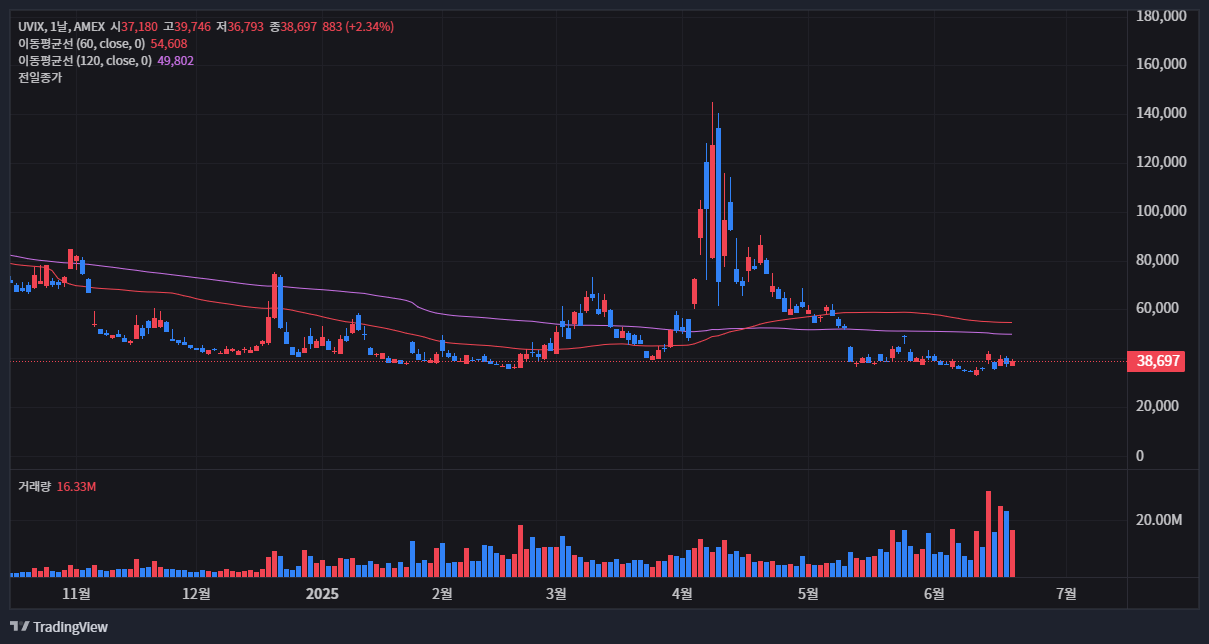 투자에 앞서 현재 UVIX의 가격을 살펴보면 약 38,697원($28.05) 수준에서 거래되고 있으며, 어제에 비해 소폭 상승한 모습을 보이고 있습니다. 하지만 이 가격이 내일 어떻게 변할지는 아무도 예측하기 어렵다는 점이 바로 이 상품의 핵심 특징입니다.