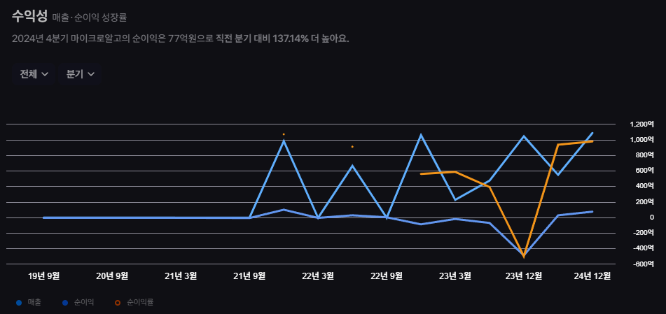 미래 가치에 대한 기대감과 별개로, 기업의 현재를 가장 객관적으로 보여주는 것은 재무 상태입니다. 토스증권에서 제공하는 정보에 따르면, 마이크로알고는 매출이 발생하고는 있지만 아직 안정적인 순이익을 내지 못하는 모습을 보입니다. 분기별로 실적 변동이 크고, 연구개발비 등 영업비용 지출도 상당합니다.