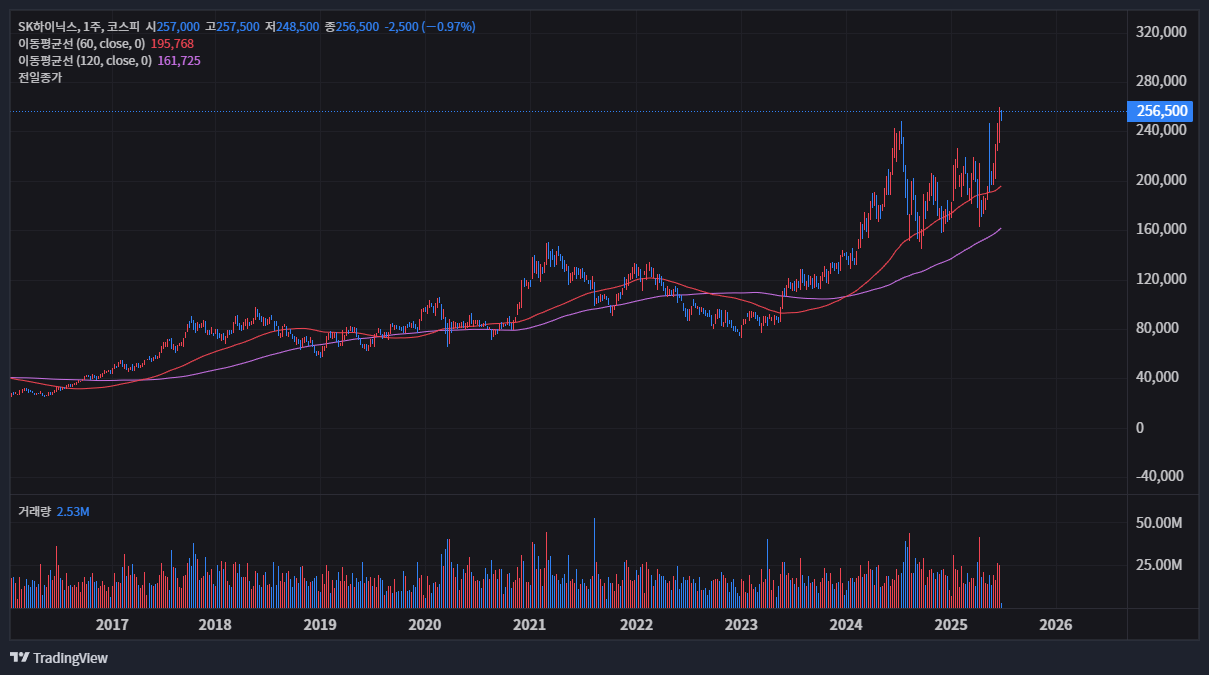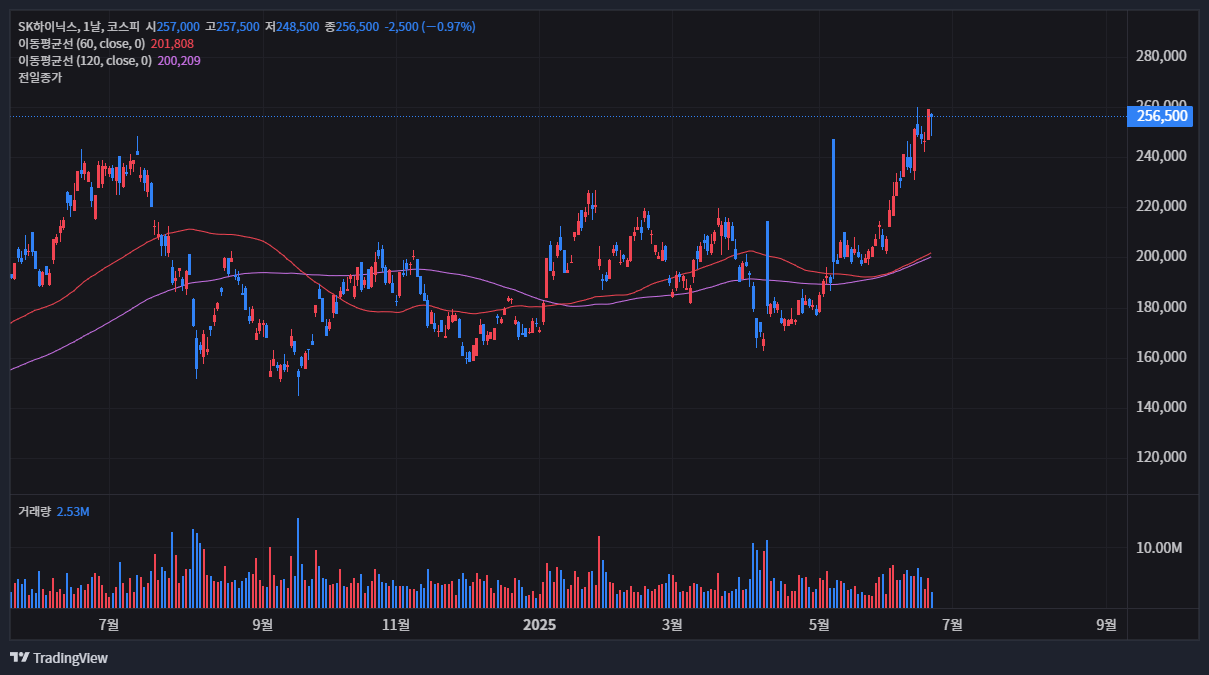 최근 SK하이닉스 주가는 강력한 상승 모멘텀을 보여주고 있습니다. 조회 시점의 현재가는 257,000원으로, 하루 만에 4%가 넘는 상승률을 기록하며 시장의 뜨거운 기대를 반영했습니다. 일별 주가 데이터를 살펴보면 견조한 거래량과 함께 꾸준히 우상향하는 패턴을 확인할 수 있는데, 이는 AI 반도체에 대한 수요가 SK하이닉스의 실적과 가치에 직접적으로 긍정적인 영향을 미치고 있음을 시사합니다. 투자자들의 관심이 집중되면서 거래대금 또한 조 단위를 넘나드는 모습을 자주 보여주고 있어 시장의 유동성이 풍부하게 공급되고 있음을 알 수 있습니다.