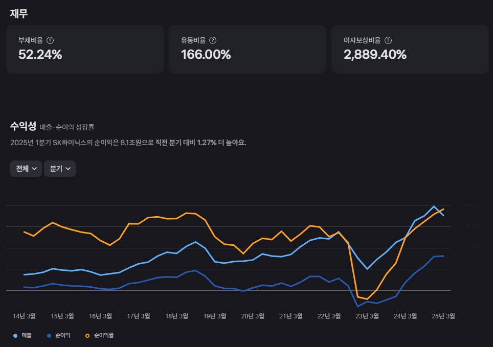 재무 안정성의 척도로 자주 사용되는 부채비율을 보면, SK하이닉스는 과거 반도체 다운사이클 시기에 부채비율이 다소 높아졌다가 최근 개선되는 흐름을 보입니다. 23년 4분기 87.52%에 달했던 부채비율은 24년 1분기 85.92%로 소폭 감소했으며, 미래 예측치에서는 25년 1분기 52.24%까지 낮아질 것으로 전망되고 있습니다. 이는 향후 실적 개선을 통해 부채 상환 능력이 크게 향상될 것이라는 시장의 기대를 반영합니다. 동종업계 경쟁사인 삼성전자와 비교하면 다소 높은 수준이지만, 산업의 특성과 향후 이익 증가세를 고려하면 충분히 관리 가능한 범위 내에 있는 것으로 평가됩니다.