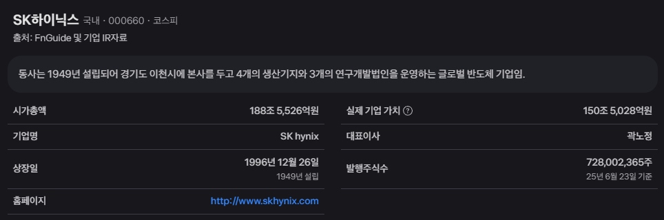 SK하이닉스는 1949년에 설립된 유서 깊은 기업으로, 현재는 경기도 이천에 본사를 두고 전 세계를 무대로 활약하는 글로벌 반도체 기업입니다. D램(DRAM)과 낸드플래시(NAND Flash)를 주력으로 생산하며, 특히 AI 연산에 필수적인 HBM 분야에서는 독보적인 기술력을 바탕으로 시장을 선도하고 있습니다. 188조 원이 넘는 시가총액이 증명하듯, 국내 코스피 시장의 대표주자이자 전 세계 투자자들이 주목하는 기술주 중 하나입니다. 안정적인 생산 기지와 지속적인 연구개발은 SK하이닉스가 급변하는 반도체 시장에서 꾸준히 경쟁력을 유지하는 원동력이 되고 있습니다.