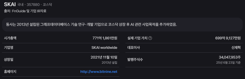 SKAI 주가의 최근 움직임에 투자자들의 관심이 쏠리고 있습니다. 스카이인텔리전스(SKAI)는 단순히 주식 시장의 한 종목이 아니라, 인공지능(AI)과 콘텐츠 제작의 미래를 바꾸고 있는 혁신적인 기술 기업으로 주목받고 있기 때문입니다. 특히 그래프 데이터베이스 기술을 기반으로 출발하여 인공지능 관련 사업으로 영역을 확장하며 새로운 성장 동력을 마련하고 있어, 현재 SKAI 주가의 흐름은 미래 가치를 가늠하는 중요한 척도가 되고 있습니다. 본 분석은 토스증권에 공개된 데이터를 바탕으로 현재 주가 상황을 짚어보고, 회사의 본질적인 가치와 앞으로의 전망을 깊이 있게 다루고자 합니다.