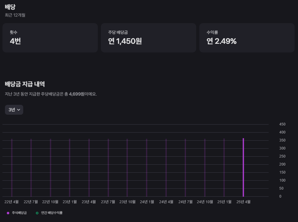 더 나아가, 과거의 배당금 지급 내역을 상세한 표로 확인할 수 있습니다. 이 표에는 배당락일(배당을 받을 권리가 사라지는 날)과 실제 배당 지급일, 그리고 당시의 주당 배당금과 연간 배당수익률이 기록되어 있습니다. 이러한 과거 배당 이력을 통해 기업의 주주 환원 정책의 일관성과 안정성을 평가해볼 수 있습니다.