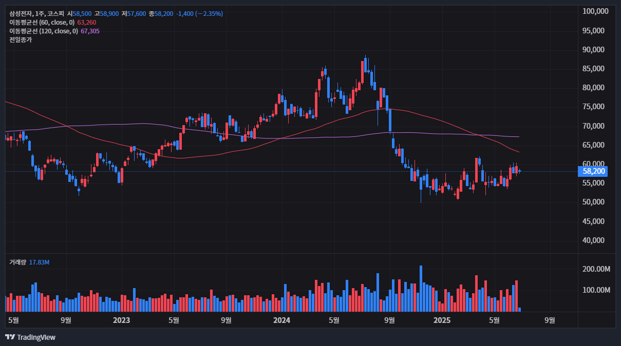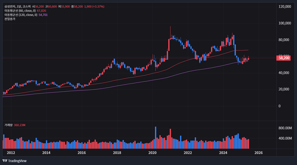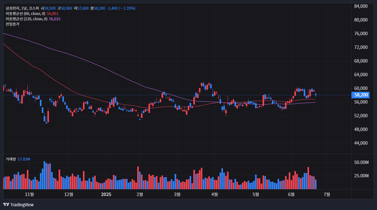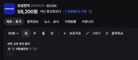 가장 먼저 눈에 들어오는 것은 삼성전자의 실시간 주가입니다. 현재가와 함께 전일 대비 얼마나 오르고 내렸는지가 직관적으로 표시됩니다. 이와 함께 당일의 시가(장이 시작할 때의 가격), 고가(가장 높았던 가격), 저가(가장 낮았던 가격)와 거래량, 거래대금 정보가 제공되어 하루 동안의 주가 흐름을 즉시 파악할 수 있습니다.