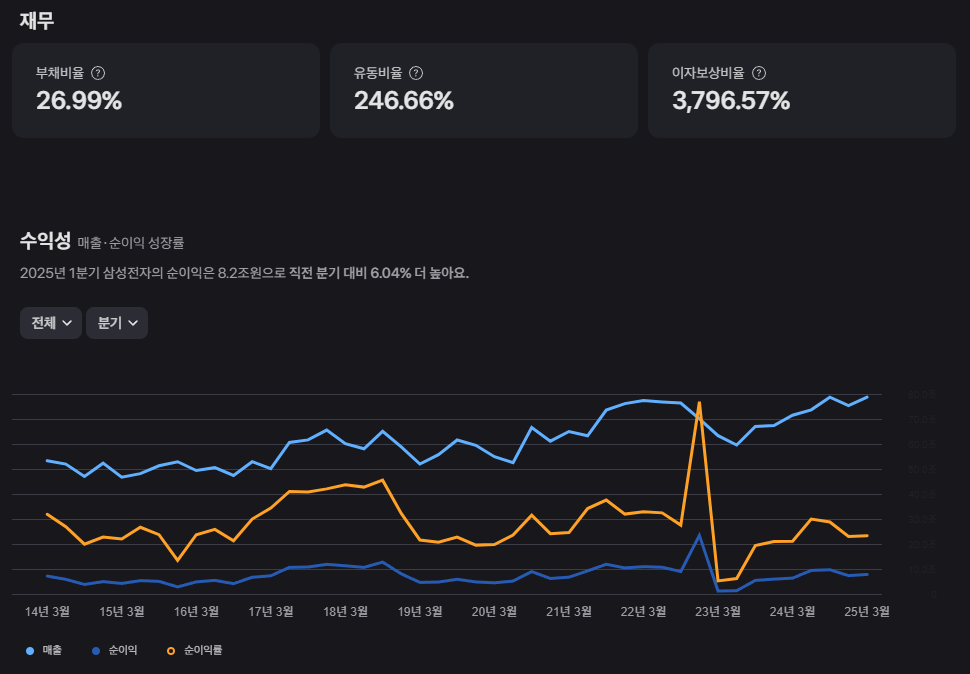 '재무 안정성' 항목에서는 기업의 총자본과 총부채, 그리고 이를 바탕으로 계산된 부채비율을 분기별로 보여줍니다. 부채비율은 기업이 가진 빚이 자본에 비해 얼마나 되는지를 나타내는 지표로, 기업의 재무 건전성을 판단하는 데 사용됩니다. 삼성전자의 부채비율을 동종업계 중앙값과 비교하여 보여주기 때문에, 상대적인 안정성을 쉽게 가늠할 수 있습니다.